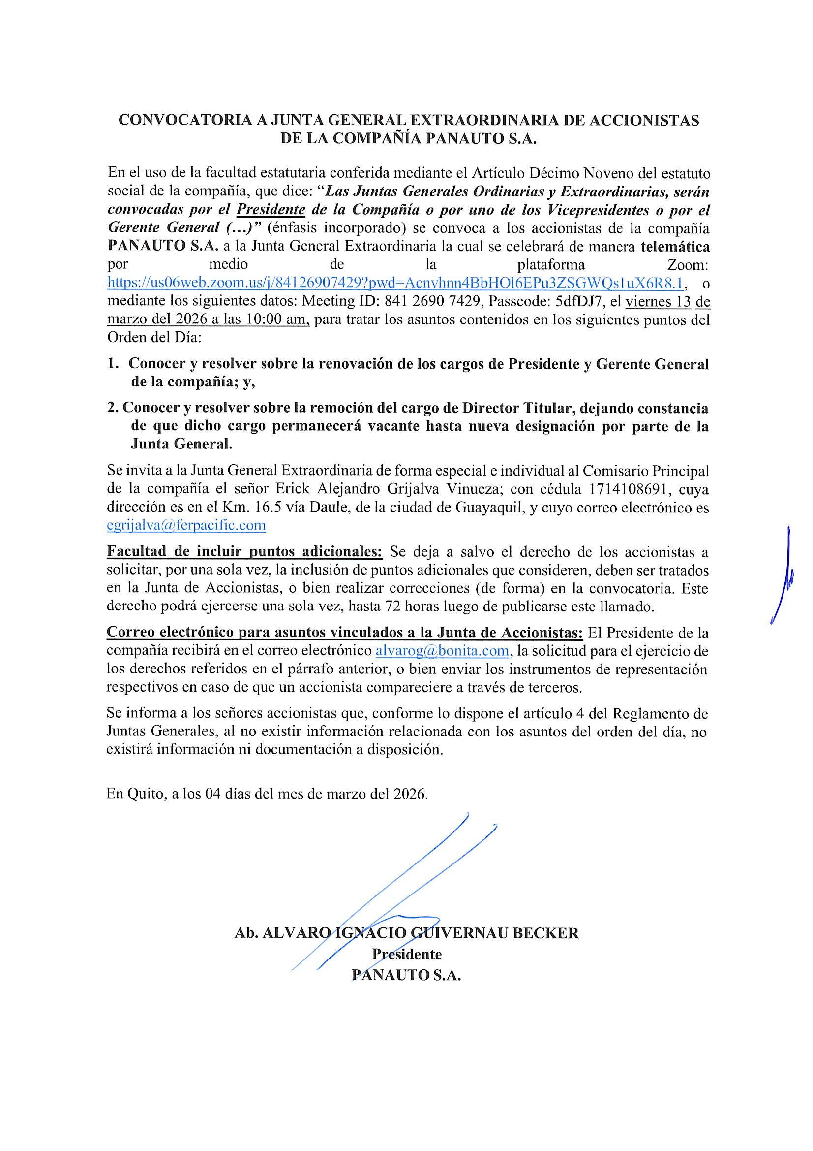 Se convoca a todos los accionistas de la COMPAÑÍA DE TRANSPORTES EXPRESSJOSUE DE POMASQUI S.A, a la JUNTA GENERAL ORDINARIA DE ACCIONISTA, con el carácter obligatorio que se realizará el día Martes 17 de marzo de 2026, a las 14H00, en el domicilio de la compañía ubicado en la parroquia Pomasqui, calle Ignacio Carrasco N1-93 y Marieta de Veintimilla, de este cantón Quito provincia de Pichincha, para tratar el siguiente orden del día: