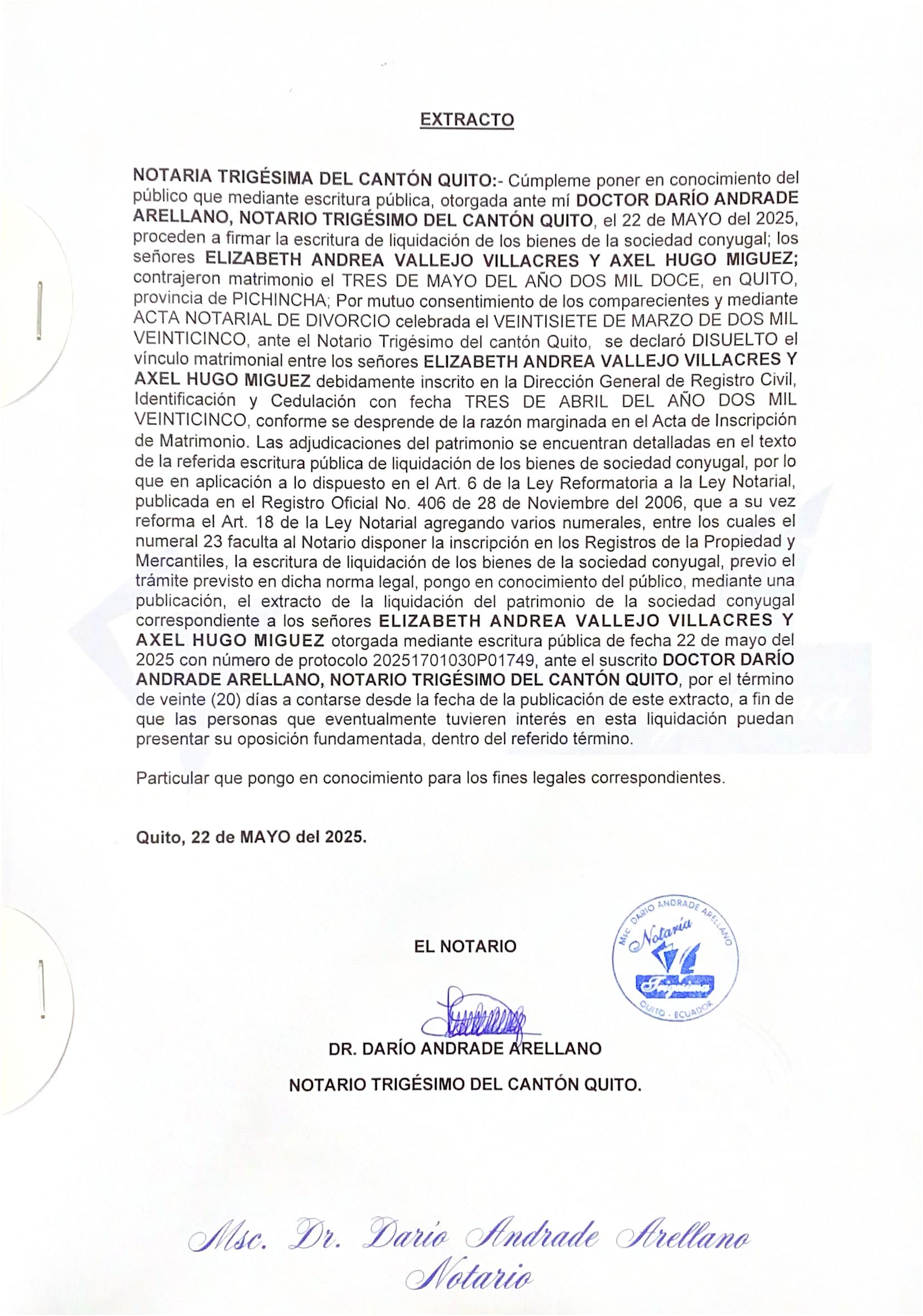 CUANTÍA. - La cuantía por su naturaleza es indeterminada. Quito, veinte y siete de mayo del 2025, de conformidad con lo establecido en el Registro Oficial No. 506, Suplemento de 22 de mayo del 2015, la ley y las atribuciones a mí conferidas, publíquese por una sola vez un extracto de la DISOLUCION, LIQUIDACIÓN Y CANCELACION DE LA SOCIEDAD CIVIL Y COMERCIAL WINE ME S.C.C., en uno de los diarios de mayor circulación a nivel nacional. Lo que pongo en conocimiento del público en general para los fines consiguientes. f).