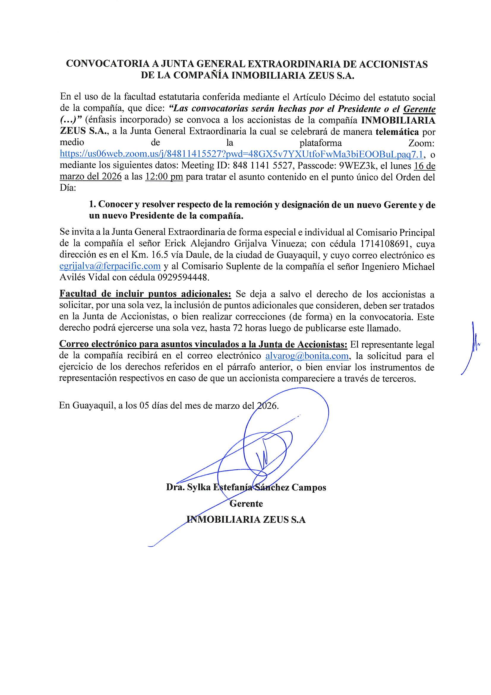 De conformidad con lo dispuesto en la Ley de Compañías, el reglamento y por los Estatutos Sociales de la compañía, se convoca a los señores accionistas a la Junta General Ordinaria que se realizará el día jueves 12 de marzo del 2026, a las 17H00, en la dirección Huasipungo No. 70 y Reino de Quito, parroquia San Antonio de Pichincha, del Distrito Metropolitano de Quito, provincia de Pichincha.