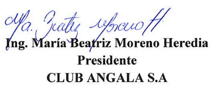En el uso de la facultad estatutaria conferida mediante el Artículo Décimo Quinto del estatuto social de la compañía, que dice: a Junta General la hará el Presidente o el Vicepresidente, a falta de éstos el Gerente de la compañía (...)” (énfasis incorporado) se convoca a los accionistas de la compañía CLUB ANGALA S.A. Extraordinaria la cual se celebrará de manera telemática plataforma Zoom: https://us06web.zoom.us/j/87490936084?pwd=FjsxjR3n tJKswwHNfLbcsuQagbsxAW.1, o mediante los siguientes datos: Meeting ID: 874 9093 6084, Passcode: 457586, el día martes 23 de septiembre del 2025 a las 10:30 am para tratar el asunto contenido en el punto único del Orden del Día: