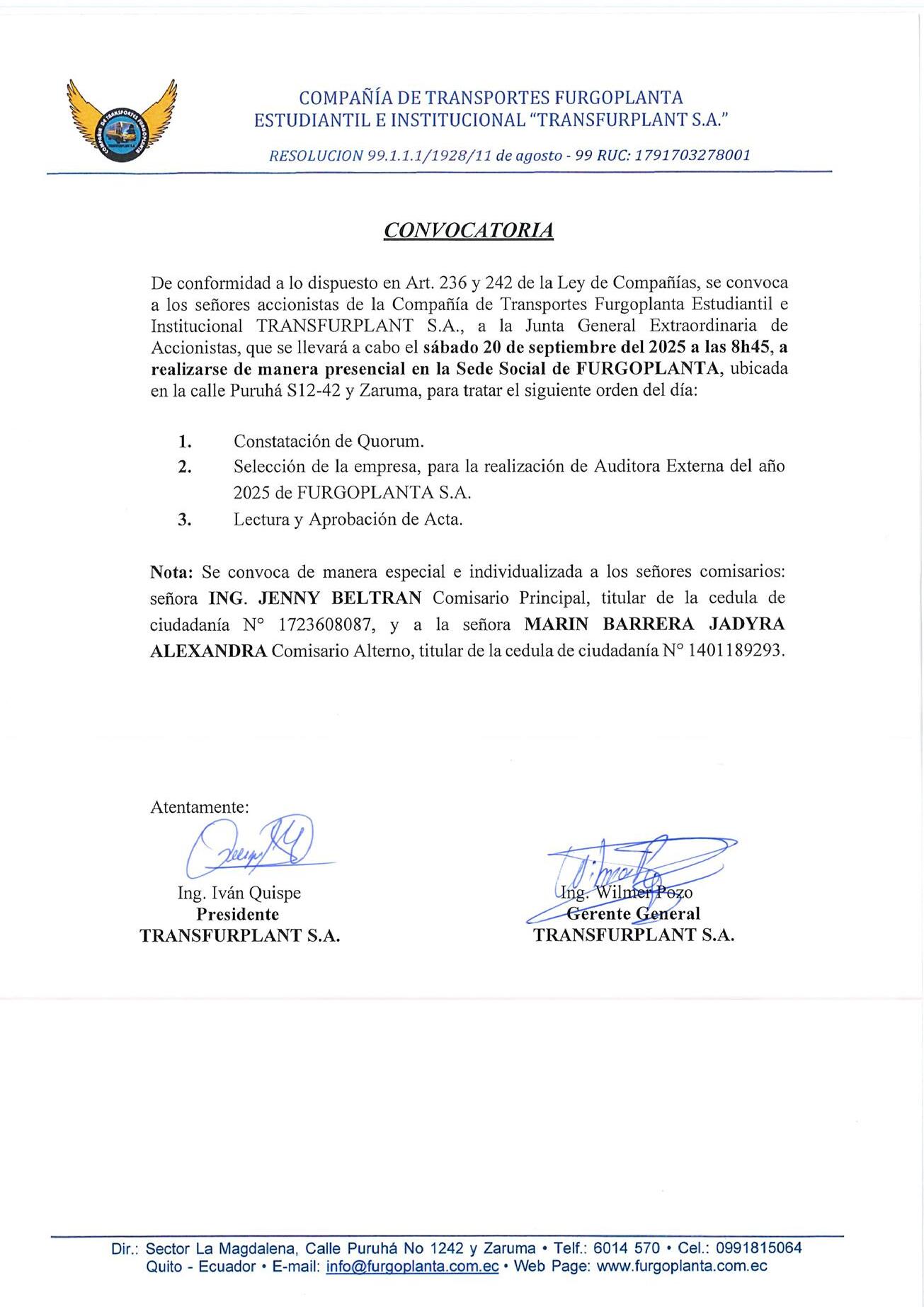 Se convoca de manera especial, personal e individualmente al Señor Portugal Pinchao Homero Luis con cedula de identidad N°1709334245, dirección domiciliaria en la Av. Eloy Alfaro y Calle Alfonso Altamirano, Presidente de la Compañía. Se pide a los socios-accionistas puntual asistencia.