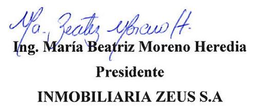 En el uso de la facultad estatutaria conferida mediante el Artículo Décimo Cuarto del estatuto social de la compañía, que dice: “La convocatoria a Junta General la hará el Presidente o el Vicepresidente, a falta de éstos el Gerente de la compañía (...)” (énfasis incorporado) se convoca a los accionistas de la compañía INMOBILIARIA ZEUS S.A., a la Junta General Extraordinaria la cual se celebrará de manera telemática por medio de la plataforma Zoom: https://us06web.zoom.us/j/88404281257 ?pwd=qX6rLrOxtAyyNz61xdmU5mnjmajxDA.1, mediante los siguientes datos: Meeting ID: 884 0428 1257, Passcode: 646601, el día Martes 23 de septiembre del 2025 a las 11:20 am para tratar el asunto contenido en el punto único del Orden del Día: