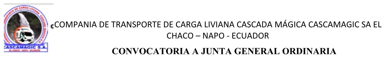 En la ciudad del Chaco a los 13 días del mes de Marzo del 2026 se convoca con carácter de obligatorio a todos los socios – accionistas de la Compania de Carga liviana Cascada Mágica Sa”” Cascamagic Sa”” a la Junta General Ordinaria el día Domingo 22 de Marzo del 2026 a las 13 h en la oficina de la Compania en las calles Francisco de Orellana y Quijos esquina para tratar el siguiente orden del día.