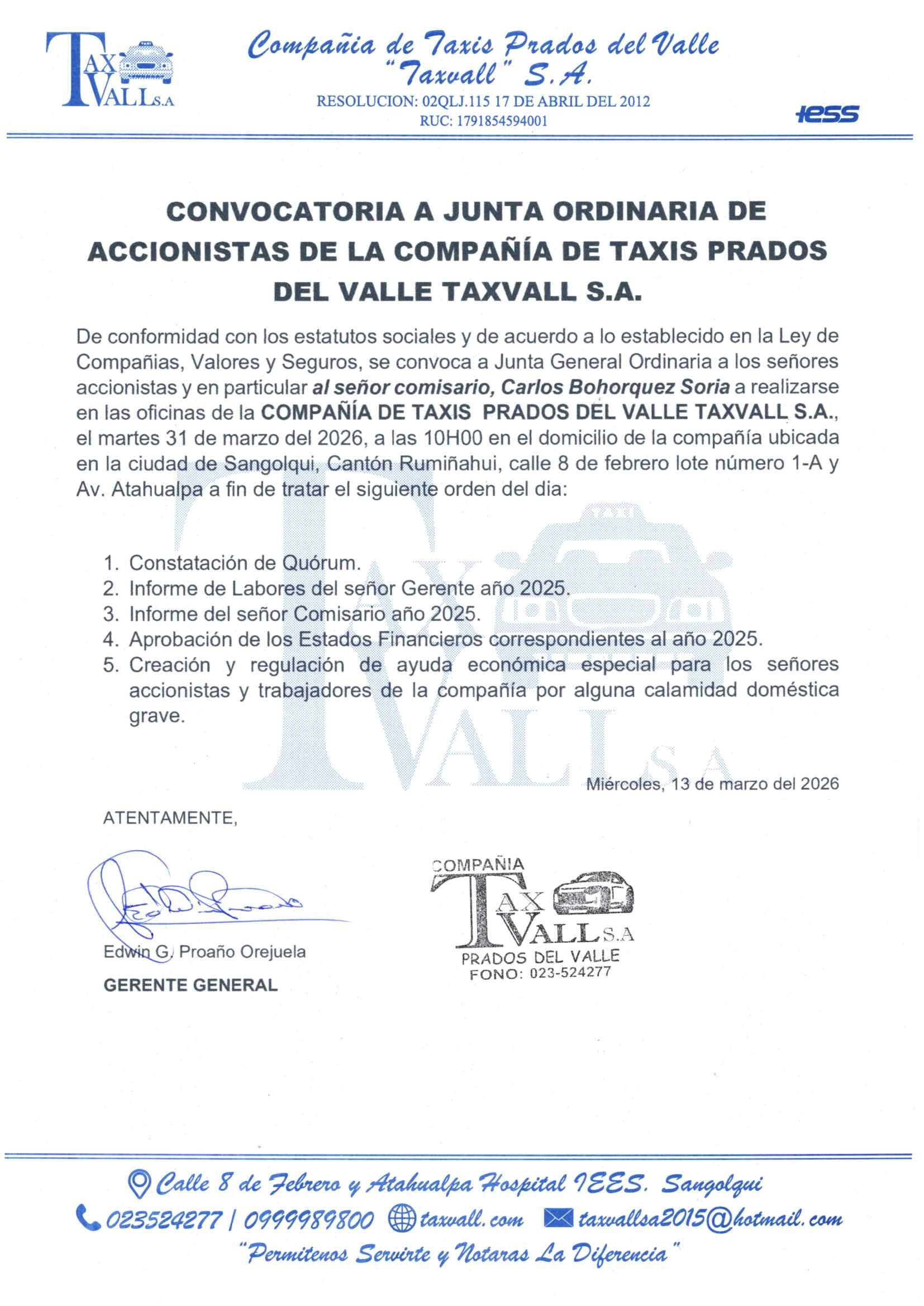 De conformidad a lo dispuesto en el Art 231, 234, 236, numerales de Ley de Compañías, se convoca a los Señores Accionistas de la Compañía SERVICIO DE TAXIS MIGRANTAXI S.A. a la Junta General Ordinaria de Accionistas, que se llevará a cabo el día Miércoles 1 de abril 2026 a las 10:00 horas a realizarse en la Sede de la Liga Barrial Amagasí del Inca, ubicada en la calle Nueces y Canelos junto al Colegio Hontanar; para tratar el siguiente orden del día.