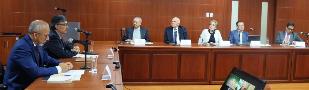 REUNIÓN. El 12 de febrero de 2026, Marco Rodríguez impulsó un Consejo Consultivo. Al fondo los expresidentes de la Corte Suprema y Corte Nacional (de izquierda a derecha): Gustavo Medina, Armando Bermeo, Paulina Aguirre, Iván Saquicela y José Suing. (Foto: CNJ)