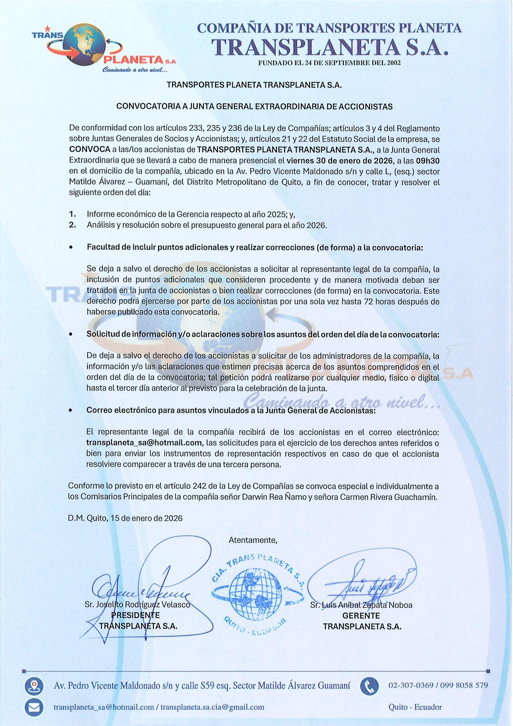 De manera especial se convoca a la Comisaria Principal de la empresa, señora Myriam Fernanda Quinaluisa Taco.