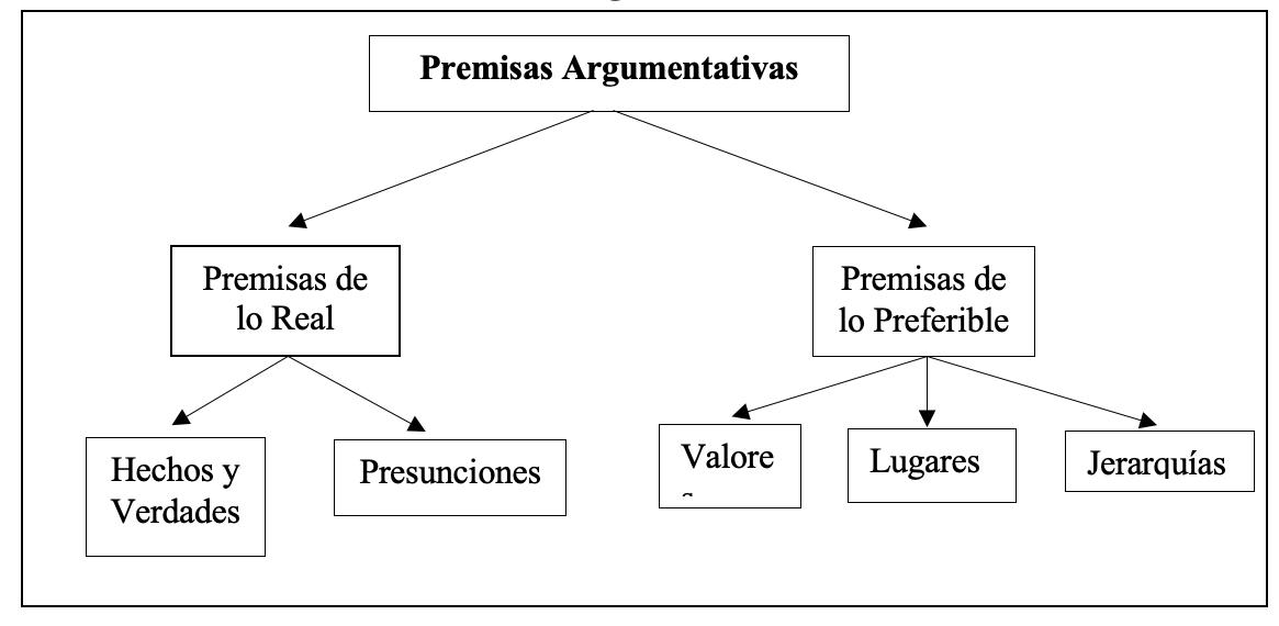 pone como punto de inicio de una argumentación la determinación de las premisas, que pueden ser normativas o no, en este caso todas estas deberán estar apegadas a las condiciones del auditorio, lo cual va a determinar si en efecto se logra una adhesión o no, Perelman distingue estas clases de premisas: