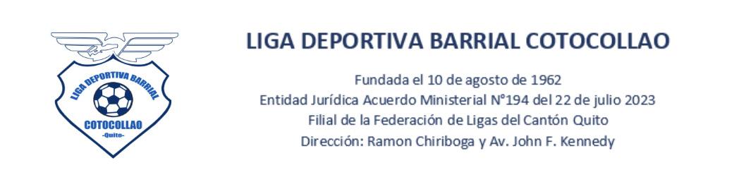 De conformidad al Art. 28 de nuestro Estatuto se convoca con el carácter de obligatorio a los clubes filiales de Liga Deportiva Barrial Cotocollao, a la Asamblea General Extraordinaria, que se realizará el día martes 10 de febrero del 2026 a las 19:30 horas, en la sala de sesiones de nuestra Institución, con el fin de tratar el siguiente orden del día: