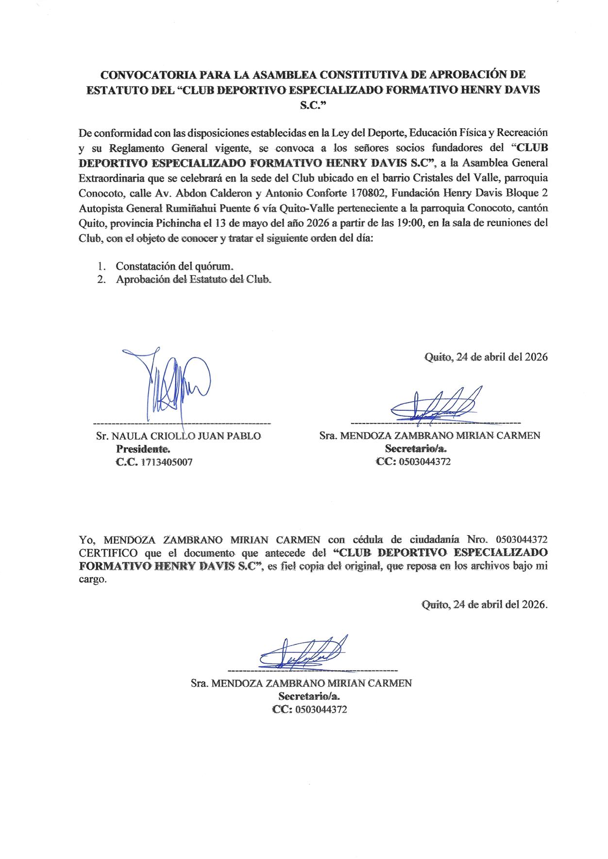 La presente convocatoria se realiza en cumplimiento de lo establecido en el Estatuto Constitución de la Compañía y la Ley de Compañías, que faculta a la Gerente General a convocar a Junta General Extraordinaria de socios cuando lo estime necesario.