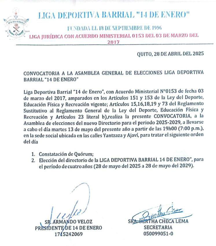 - Se solicita a todos los interesados su puntual asistencia y participación activa para la constitución de esta organización, orientada a promover la formación integral de jóvenes a través del deporte.