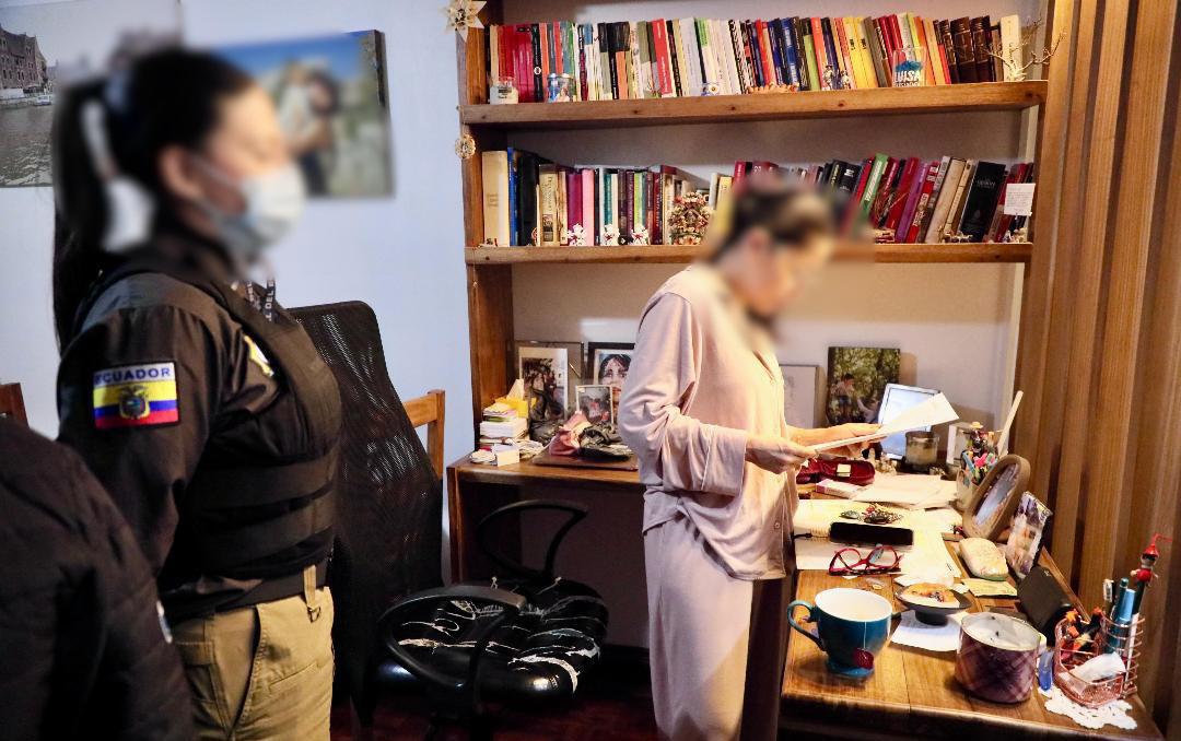 La Fiscalía investiga el ingreso de dinero ilícito procedente de Venezuela a la campaña presidencial de la Revolución Ciudadana de 2023. Luisa González, Andrés Arauz, Patricio Chávez y otros están entre los investigados. A la izquierda de la imagen está una mujer policía, quien usa un chaleco antibalas y con postura firme. Delante hay otra mujer que luce el cabello recogido, viste pijama de color rosa y sujeta firmemente unos documentos con ambas manos.