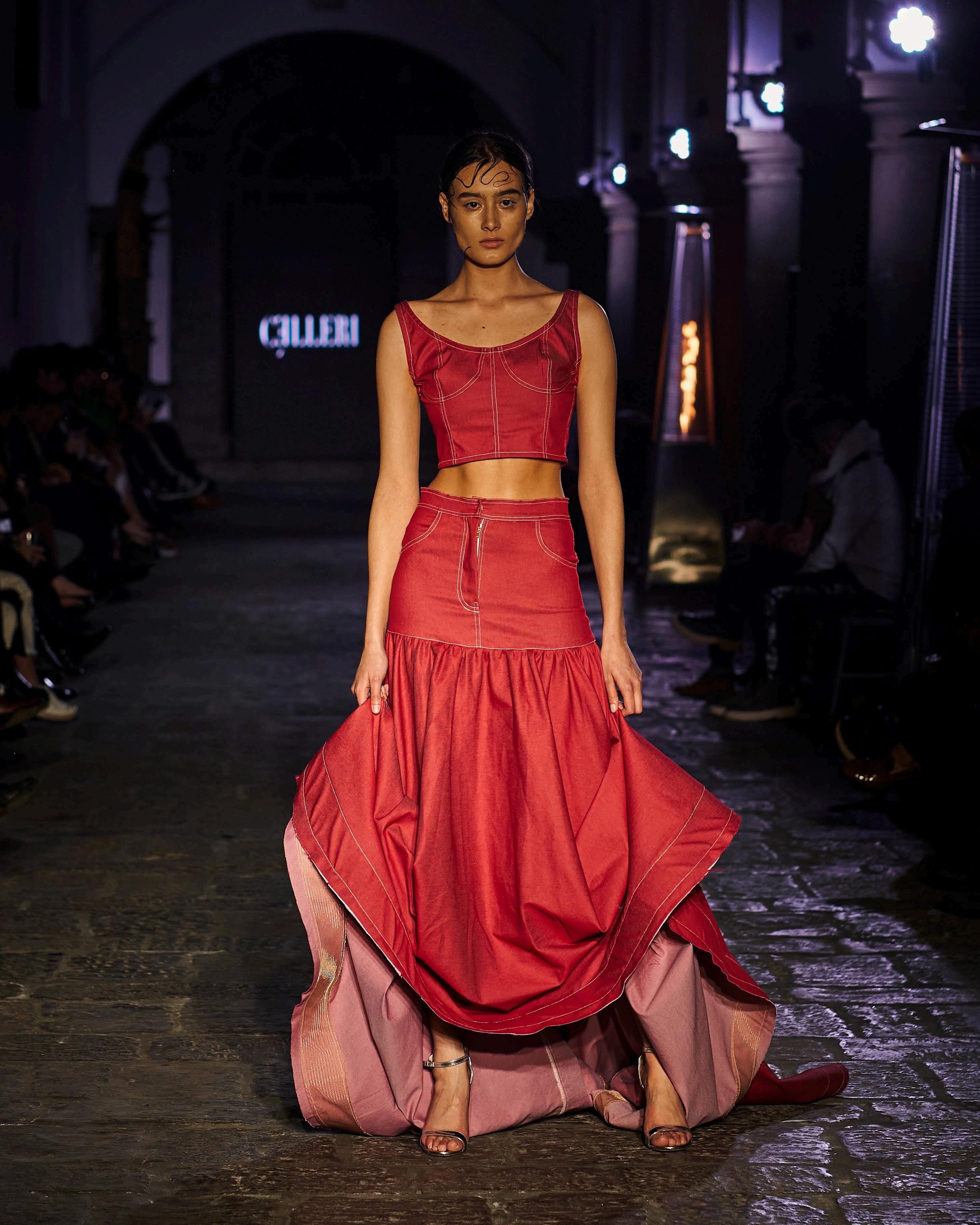Una estética que dialoga con la tradición gitana cargada de fuego, sombra y pasión. Sus creaciones evocan la libertad de los caminos, la naturaleza nómada y libre. Cada prenda se convierte en ritual de movimiento, memoria y resistencia, una invitación a vivir el arte de vestir como tributo a lo ancestral y lo rebelde.