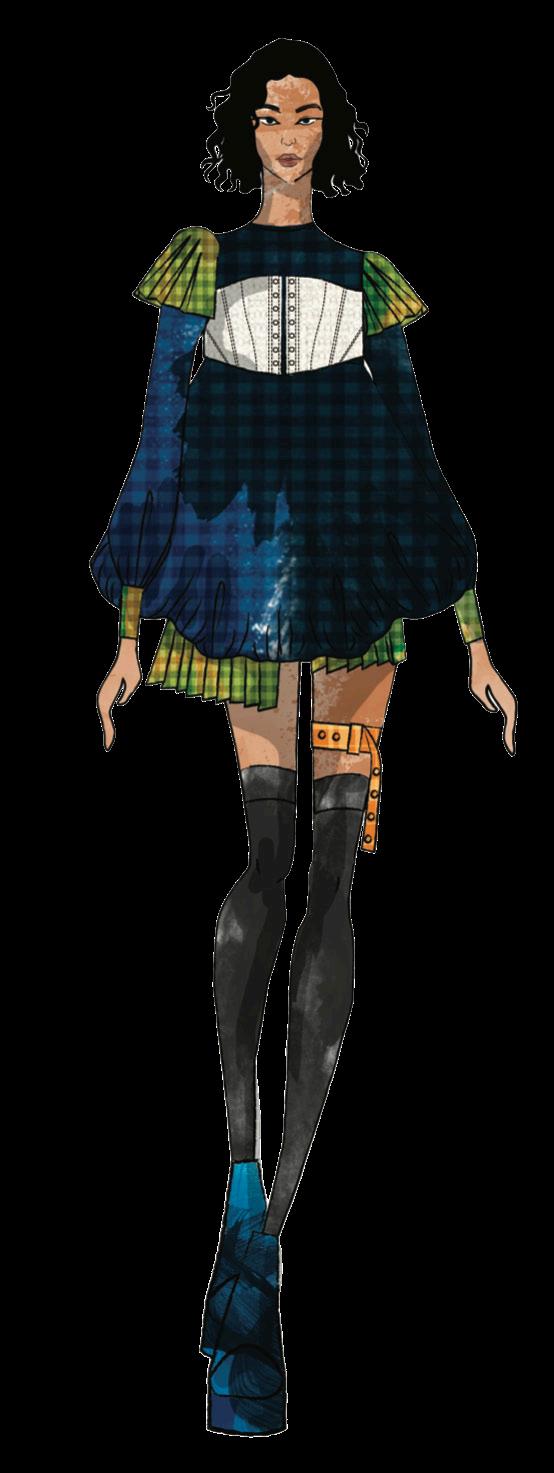 “Contrapunto” es un diálogo entre opuestos: el blanco del cal y el azul intenso del cielo quiteño, la simetría del ajedrezado en cúpulas y zaguanes, la historia y la modernidad. Inspirada en la arquitectura colonial de Quito, la colección traduce estos contrastes en formas, texturas y colores que encarnan el espíritu de la ciudad. Con una estética barroco-punk contemporánea, corsets, faldas estructuradas, camisas y accesorios que se construyen a partir de telas a cuadros, tinturas e intervenciones textiles.