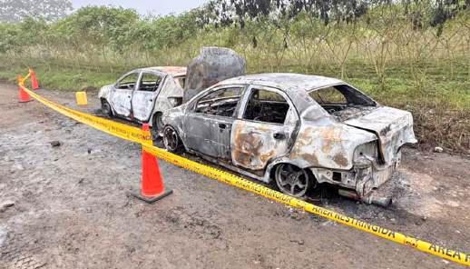 TRAGEDIA. Dos de los tres carros que utilizaba la familia secuestrada y asesinada aparecieron quemados.