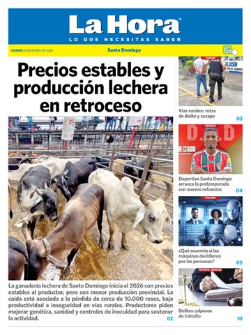 La ganadería lechera de Santo Domingo inicia el 2026 con precios estables al productor, pero con menor producción provincial. La caída está asociada a la pérdida de cerca de 10.000 reses, baja productividad e inseguridad en vías rurales. Productores piden mejorar genética, sanidad y controles de inocuidad para sostener Delitos culposos de tránsito la actividad. 02