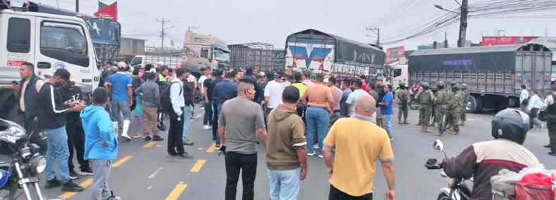 Los transportistas de carga pesada paralizaron la vía a Quevedo durante nueve horas para exigir mayor seguridad ante robos y secuestros en las carreteras. Denunciaron la falta de apoyo estatal; además, reclamaron la derogación del subsidio al diésel y pidieron diálogo con las autoridades. 03