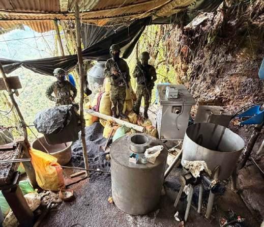 En recorridos militares se han encontrado minas activas con motores, taladros, poleas, piscinas de procesamiento y otros equipos que revelan la permanencia de redes ilegales en la zona.