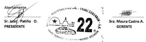 De conformidad con las normas de la LEY DE COMPAÑÍAS Y DEL ESTATUTO SOCIAL, se convoca a los señores accionistas de la COMPAÑÍA DE TAXIS “FRANZ CORONADO” S.A. N.-22 a la JUNTA GENERAL EXTRAORDINARIA, que tendrá lugar en el Complejo de la Compañía “Las Macadamias” ubicada en la Vía Quevedo Km. 6 1/2 entrada a Puerto Limón, para el día Viernes 06 de Junio del 2025 a las 10h:00 a.m. (Diez de la mañana), para tratar el siguiente orden del día: