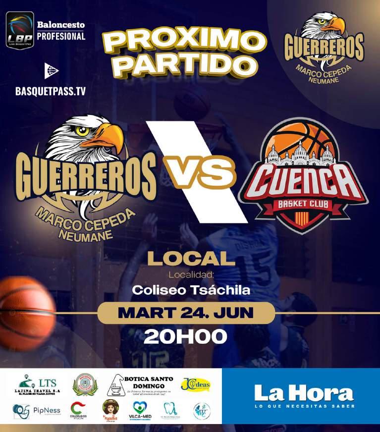 La fiesta y emociones de la Liga de Baloncesto Profesional (LBP) continúan esta noche en Santo Domingo con el enfrentamiento entre Guerreros del Neumane y Cuenca Basket Club. El comité organizador hizo un ajuste en esta programación y determinó que el partido inicie a las 20:00 en las instalaciones del coliseo Tsáchila.