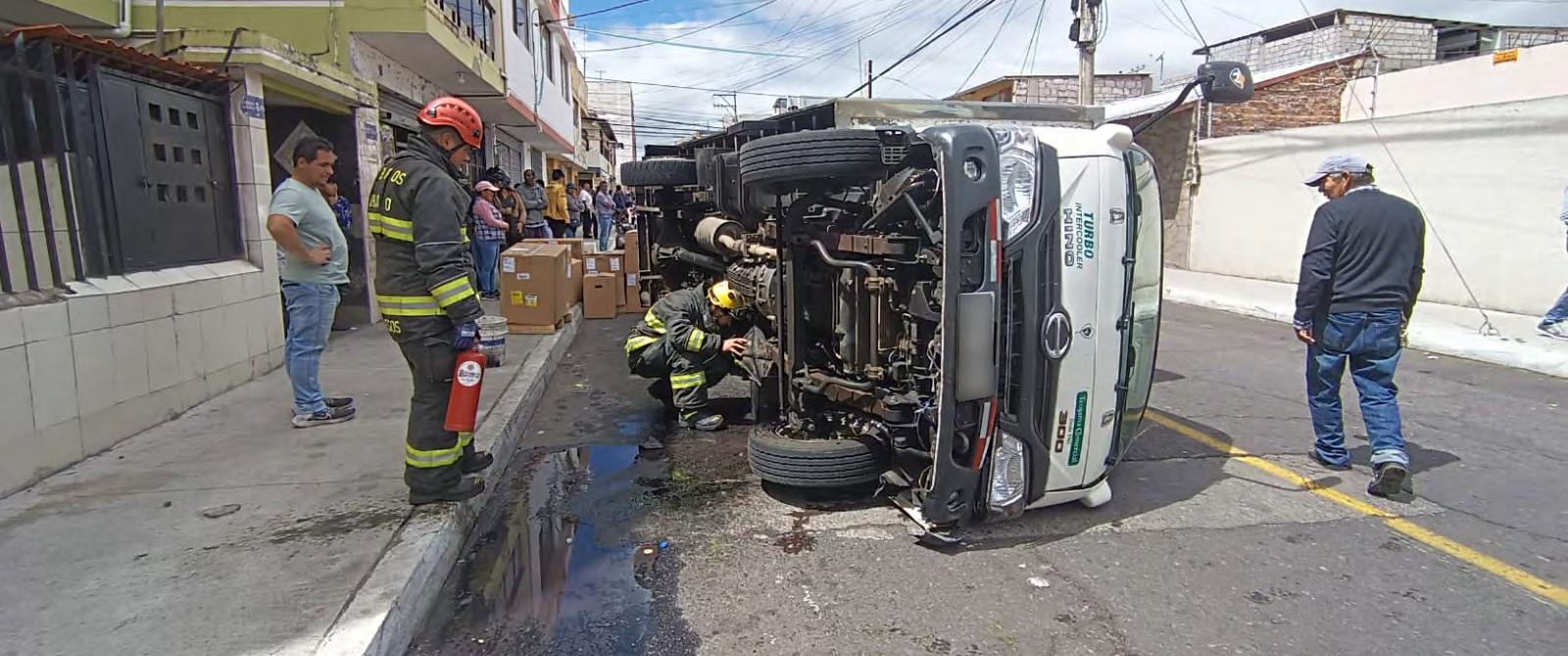el taxi que se movilizaba por la calle Isidro Viteri, producto de ello el vehículo grande se desestabilizó y quedó volcado en la calzada.