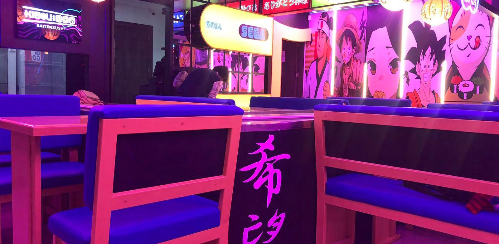El lugar está ambientado para transportar a los clientes al corazón de Tokio. Los colores y luces de neón del local están inspirados en el barrio Akihabara. La tecnología japonesa también está presente en las referencias a los videojuegos clásicos y en ‘Blue’, la robot anfitriona del lugar que ubica a los clientes en sus mesas, sirve ciertos platillos, baila, e incluso celebra los cumpleaños de los clientes.
