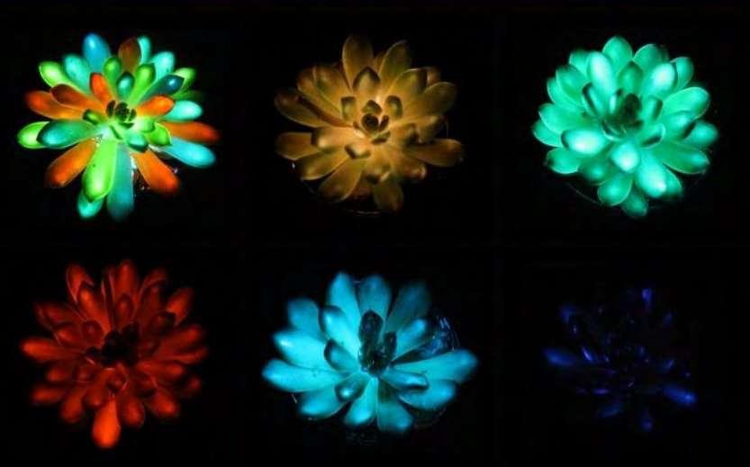 · Científicos chinos han inyectado partículas de fósforo “ luminiscentes ” para crear las primeras plantas que brillan en la oscuridad, con luminiscencia azul, verde, roja y azul violeta. En un artículo publicado en la revista Matter , investigadores crearon suculentas (plantas que tienen tejidos horribles y carnosos para almacenar agua) que brillan en la oscuridad y se recargan con la luz solar. Inyectadas con compuestos emisores de luz, las plantas pueden brillar en varios colores y rivalizar con una pequeña luz nocturna en su punto más brillante. Este método simple y ec onómico podría sentar las bases para sistemas de ilum ina-