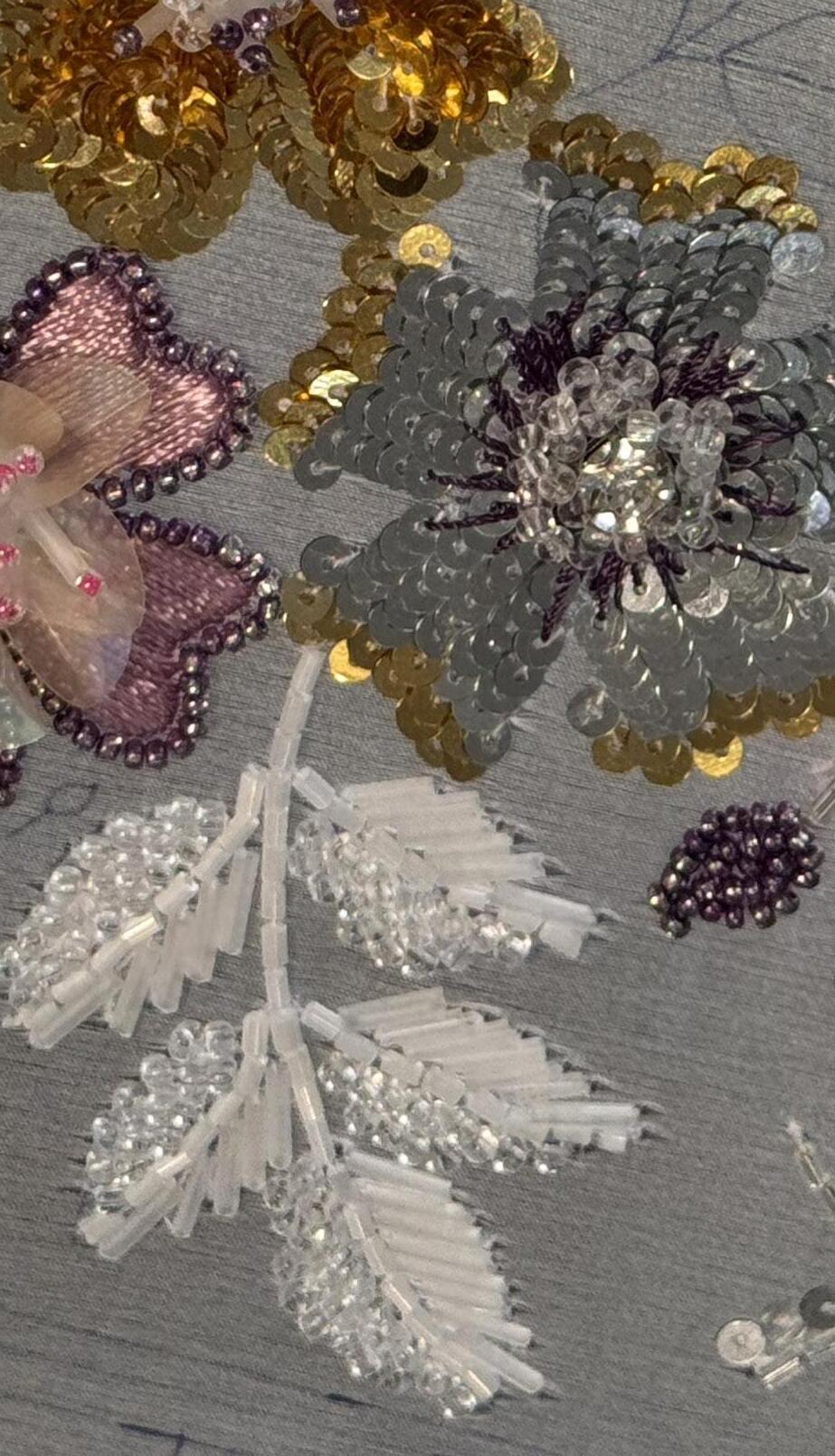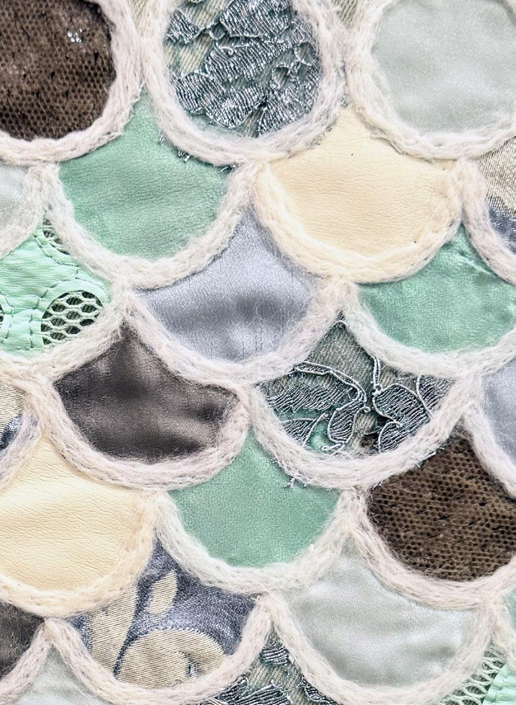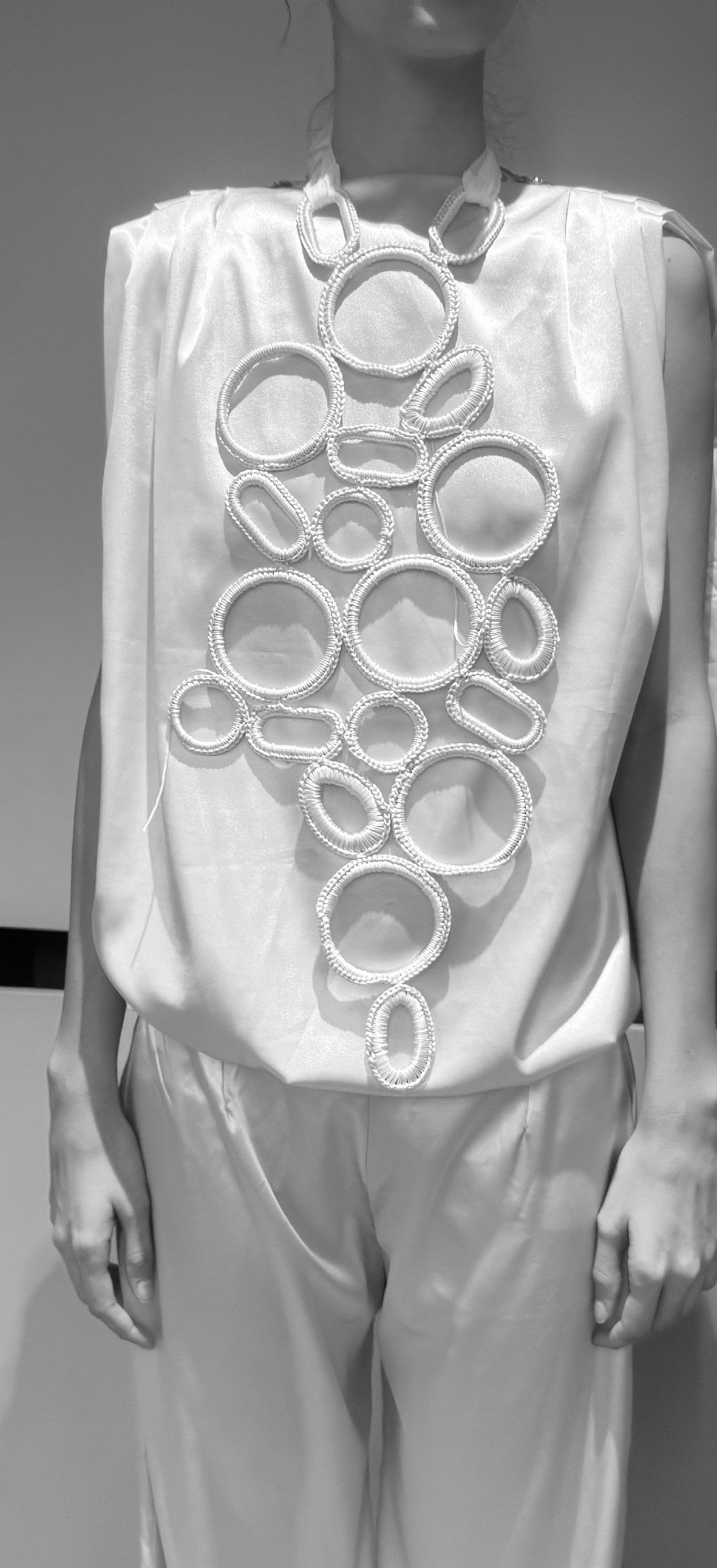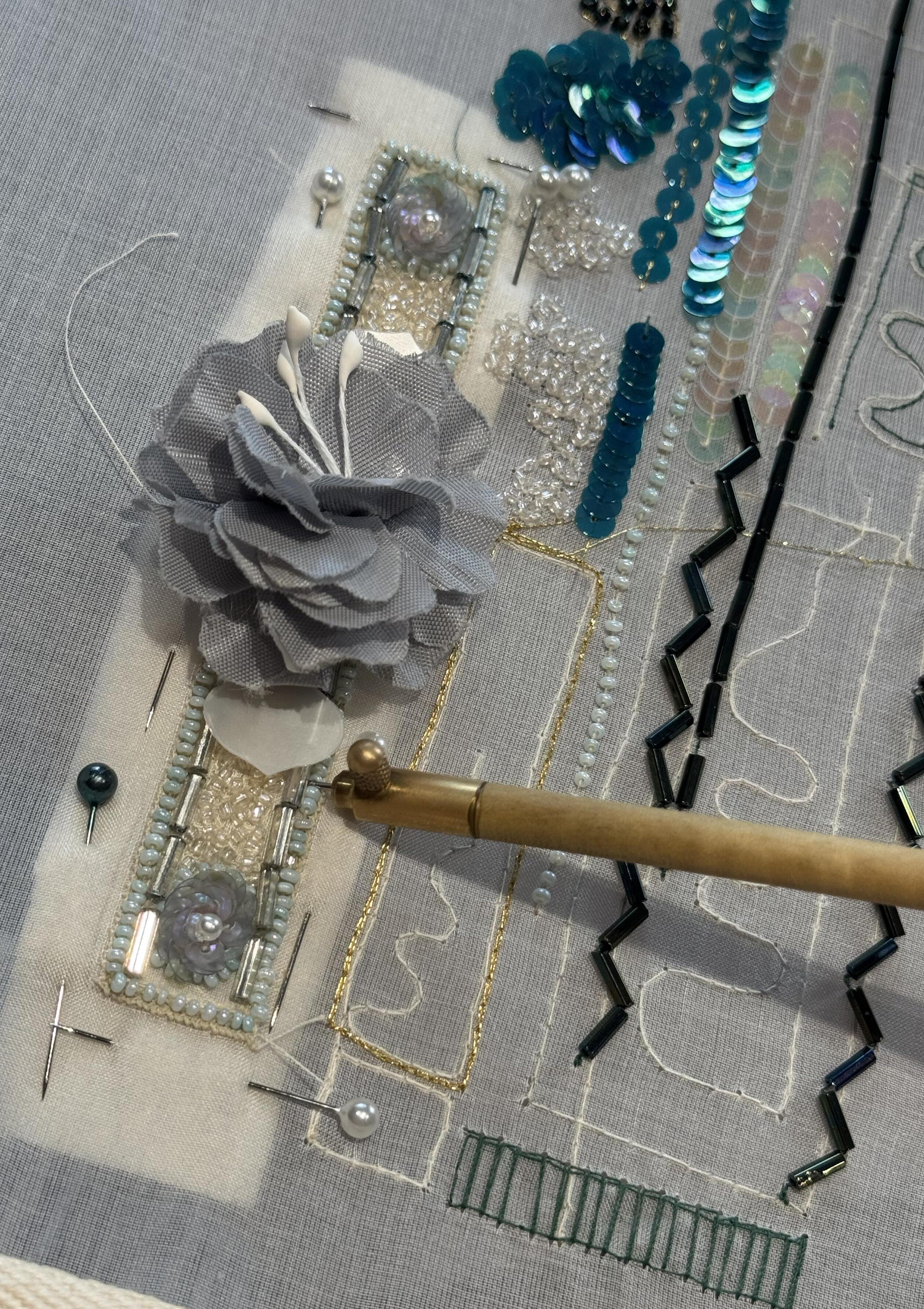 This work explores embroidery through a combination of Lunéville hook techniques used in haute couture and traditional hand embroidery with silk threads. Developed through specialised training in Lyon and Barcelona, the process focuses on creating three-dimensional surfaces by experimenting with texture, shape, and material combinations. The aim is to push embroidery beyond decoration into a more structural and tactile form.