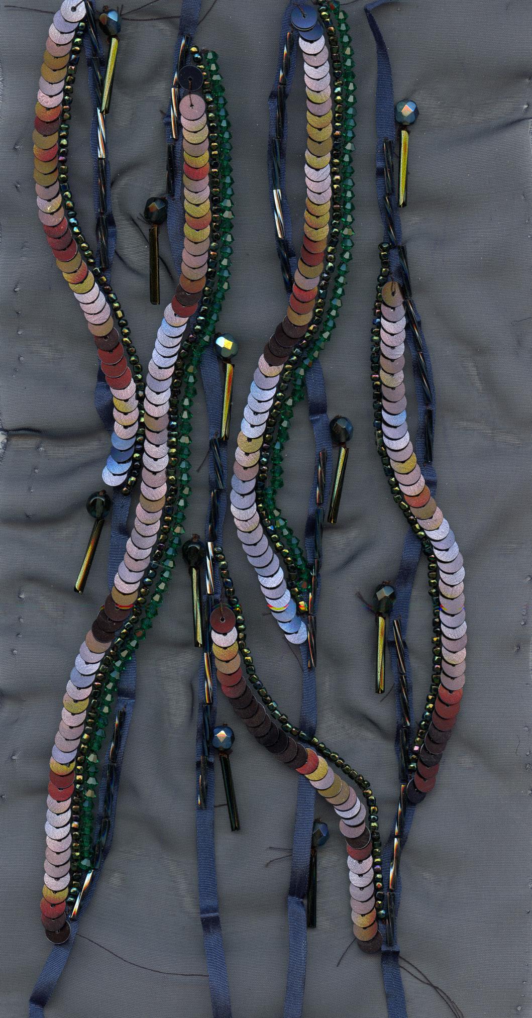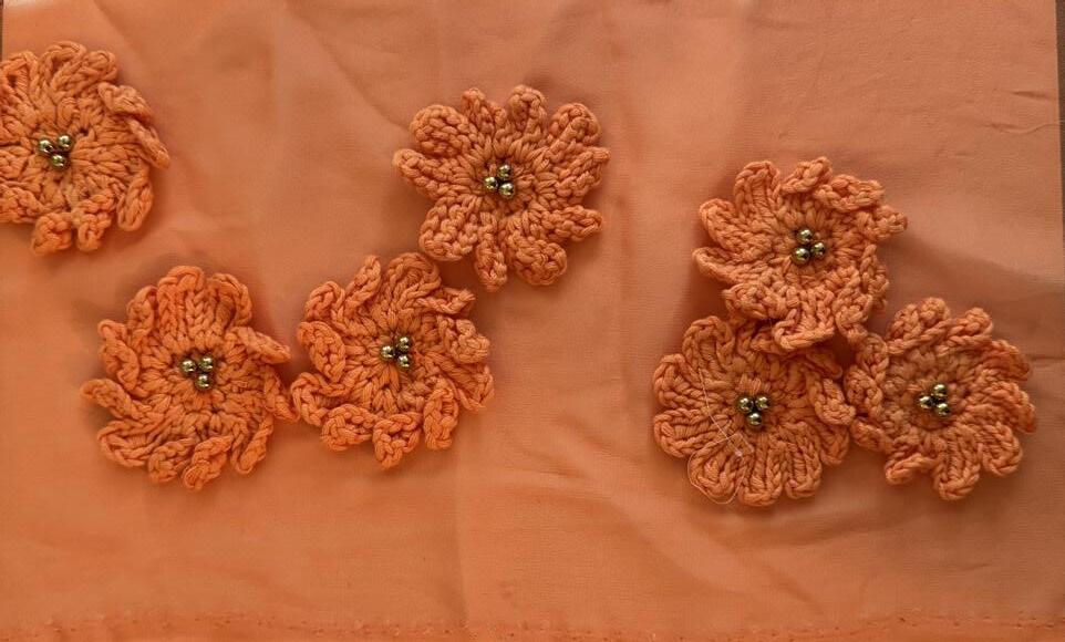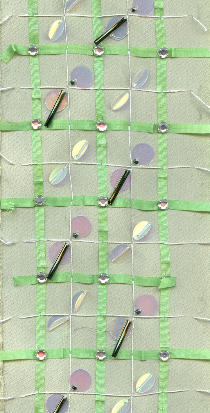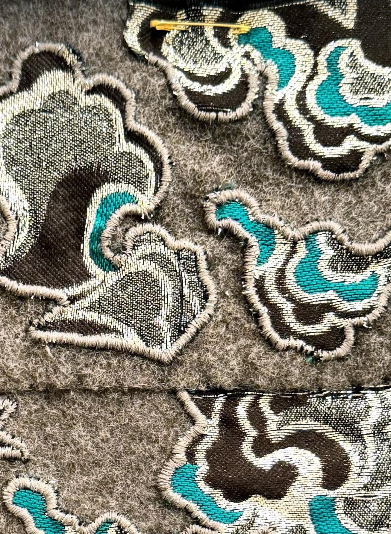 This work explores embroidery through a combination of Lunéville hook techniques used in haute couture and traditional hand embroidery with silk threads. Developed through specialised training in Lyon and Barcelona, the process focuses on creating three-dimensional surfaces by experimenting with texture, shape, and material combinations. The aim is to push embroidery beyond decoration into a more structural and tactile form.