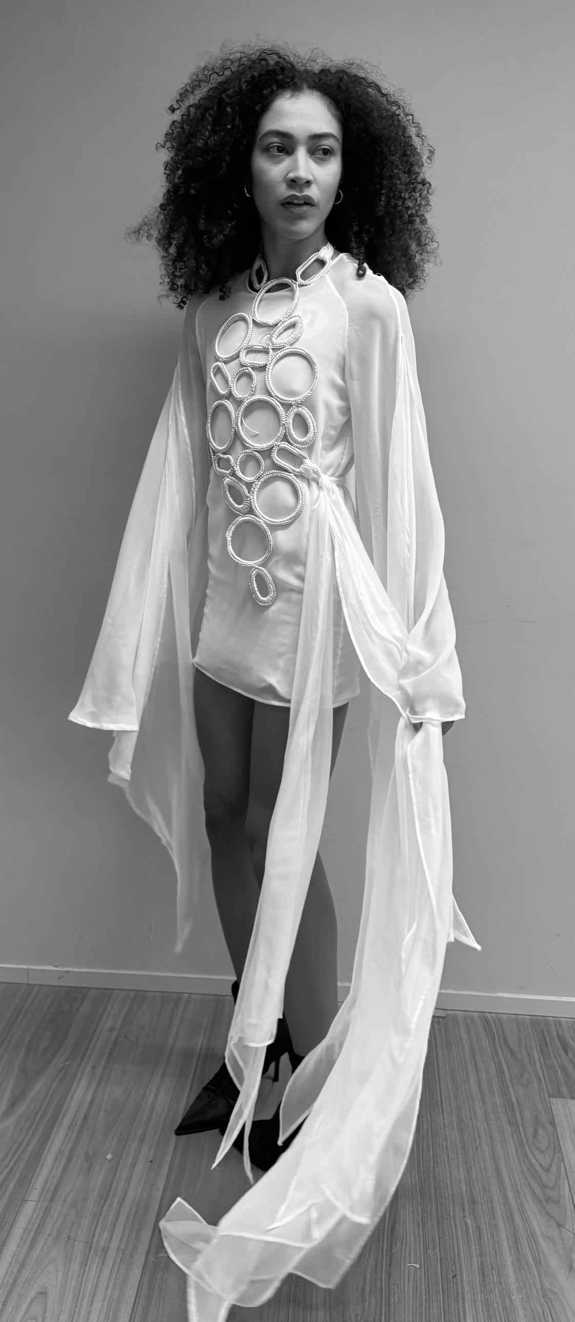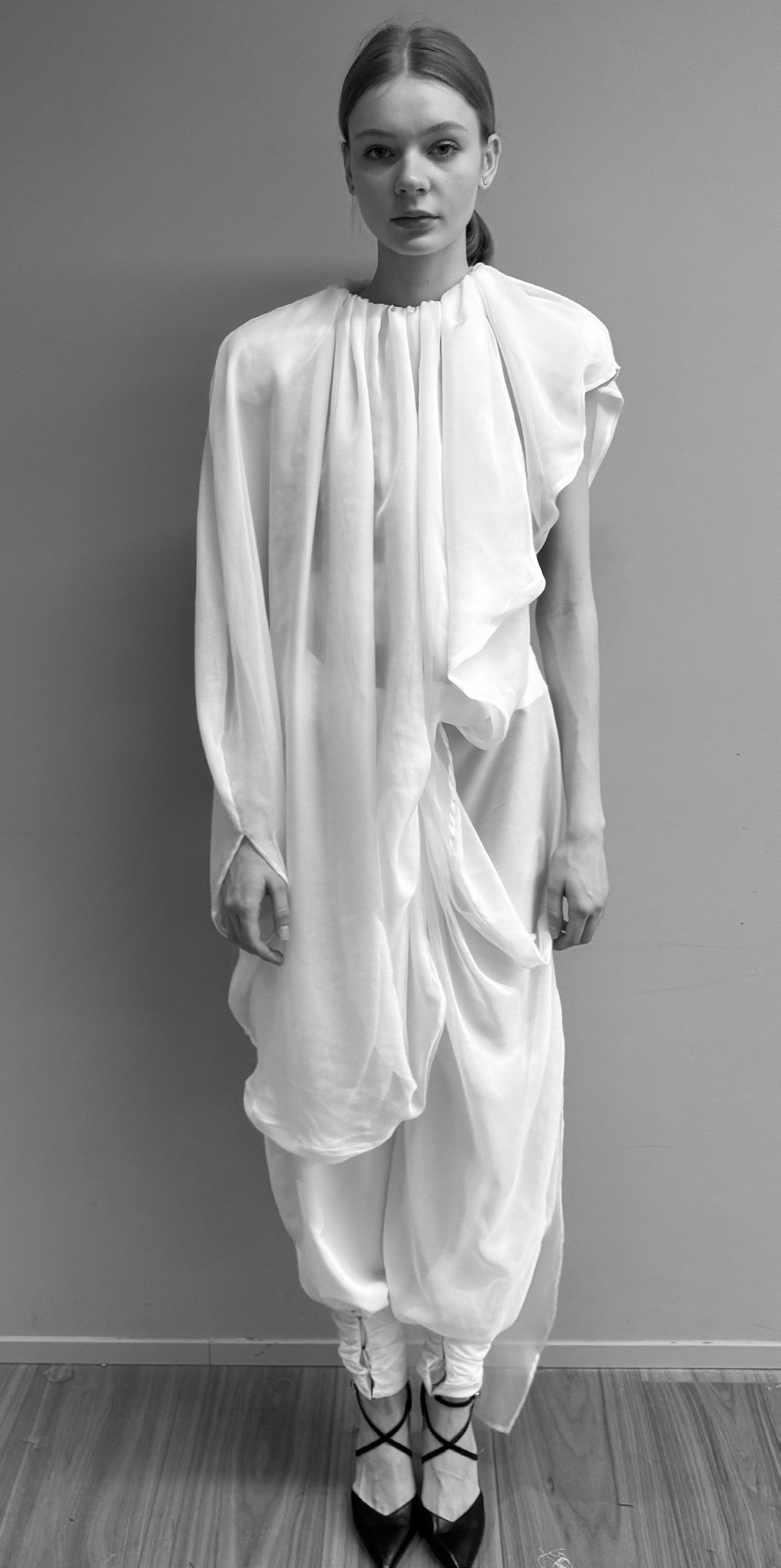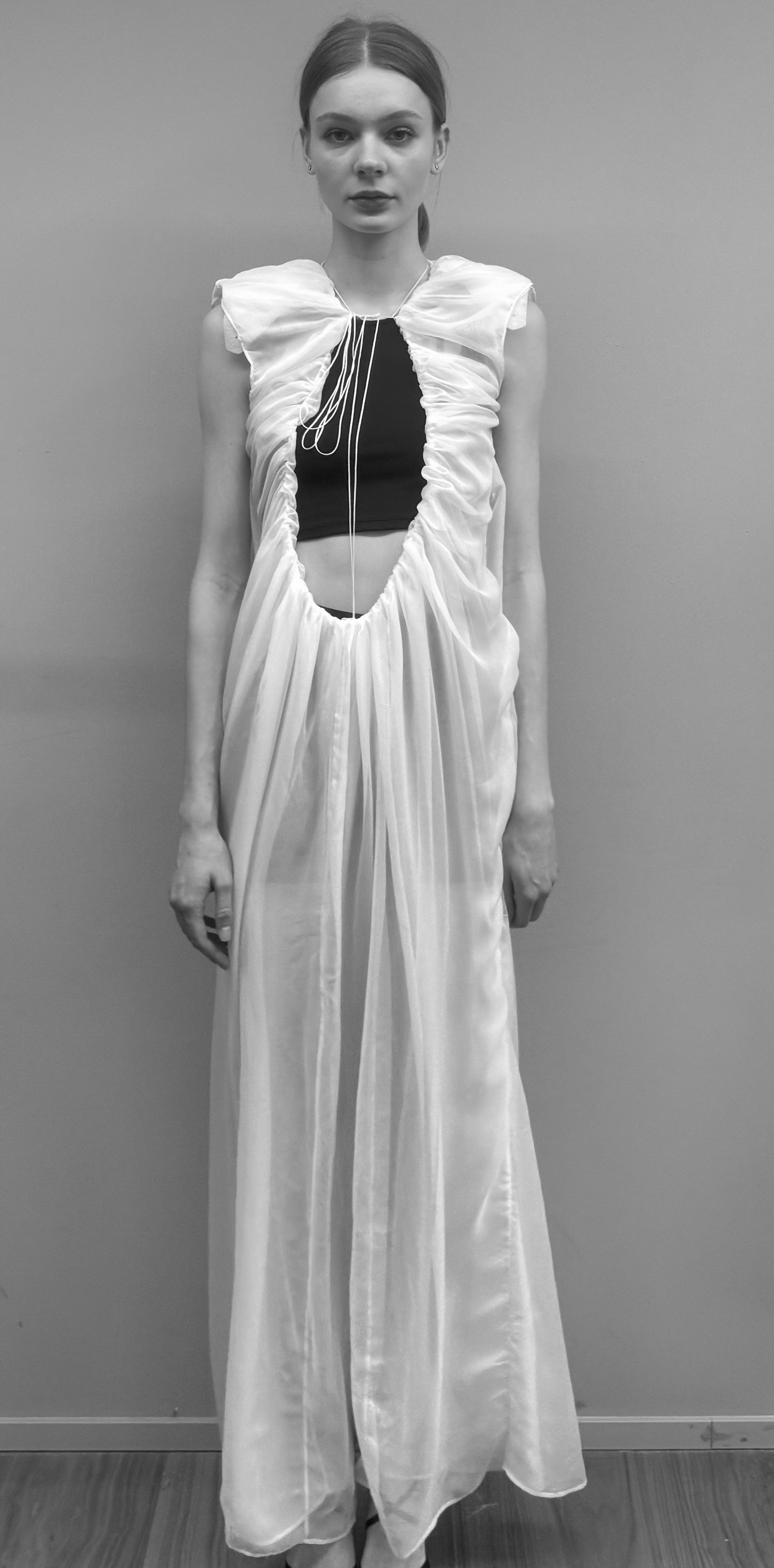 All pieces are made in chiffon, a delicate and fluid material that contrasts with the scale of the forms. French seams were used throughout for clean internal finishes and precise construction, while manual gathering allowed careful control of fullness, shaping the fabric into structured yet airy forms.