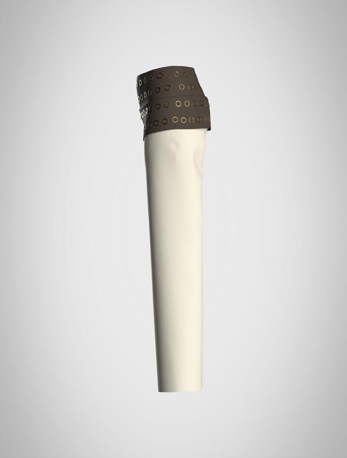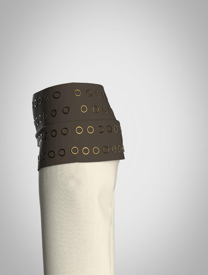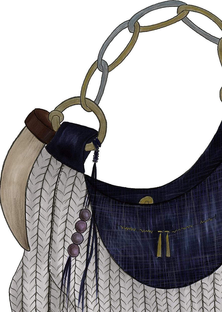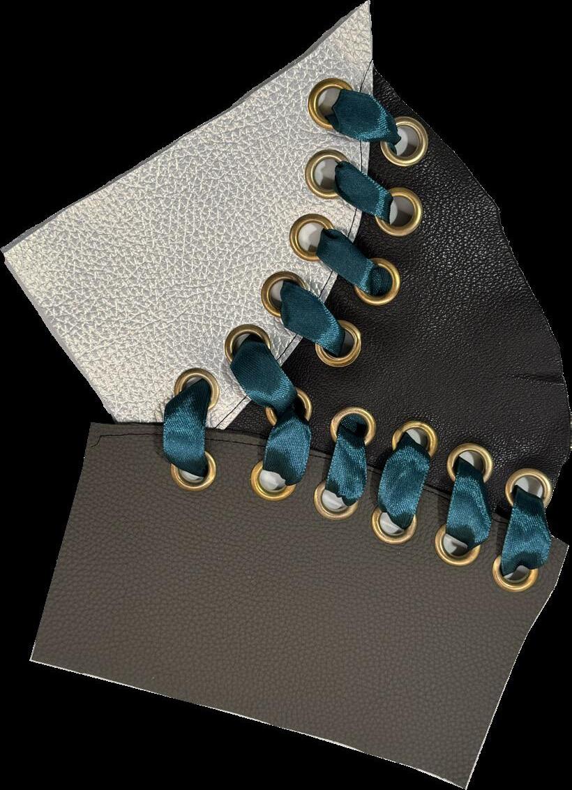This accessory combines three different types of leather, selected for their contrasting textures and structural qualities. The materials are connected through metal eyelets, with a ribbon threaded through to bind the elements together, creating both tension and flexibility. Technical drawings and construction details were developed digitally using Adobe Illustrator to ensure precision in proportion and placement.