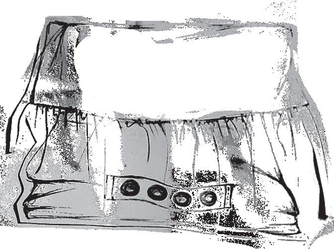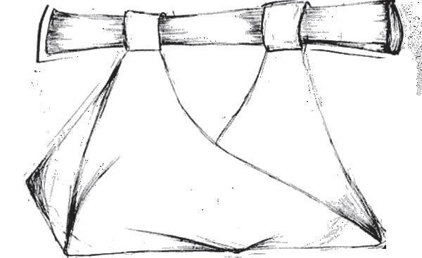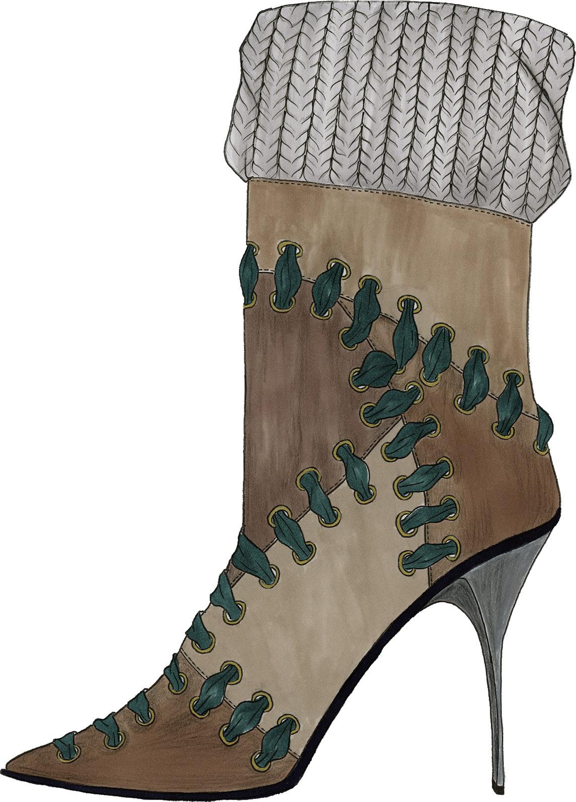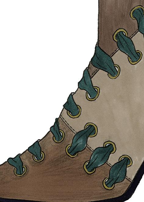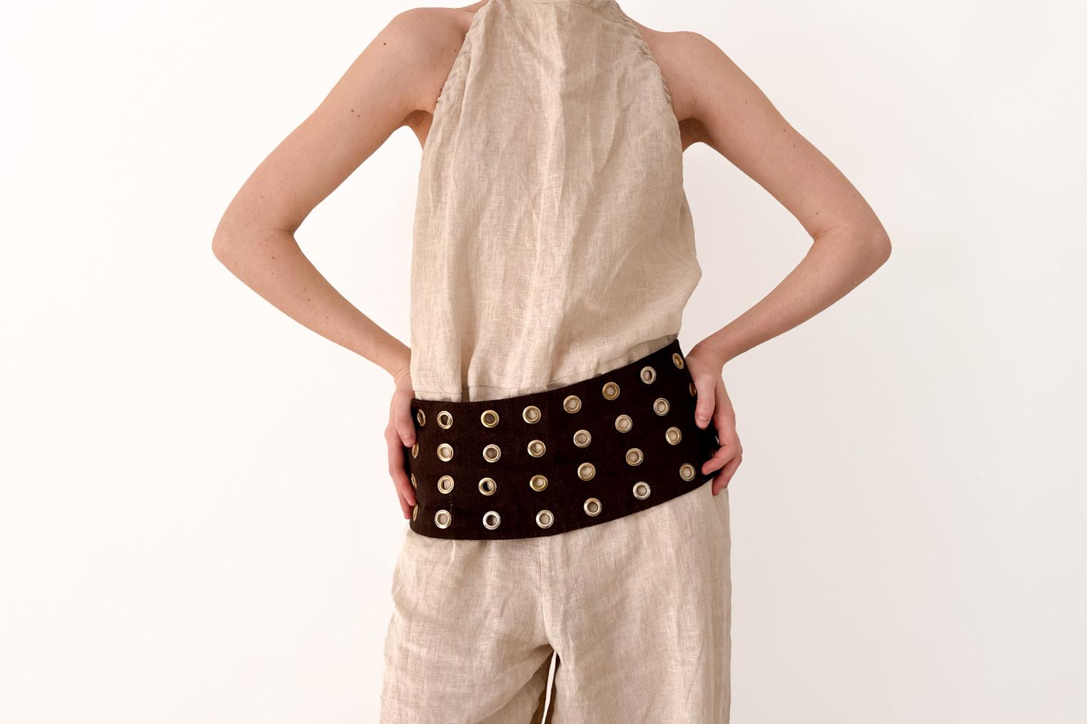 This accessory combines three different types of leather, selected for their contrasting textures and structural qualities. The materials are connected through metal eyelets, with a ribbon threaded through to bind the elements together, creating both tension and flexibility. Technical drawings and construction details were developed digitally using Adobe Illustrator to ensure precision in proportion and placement.