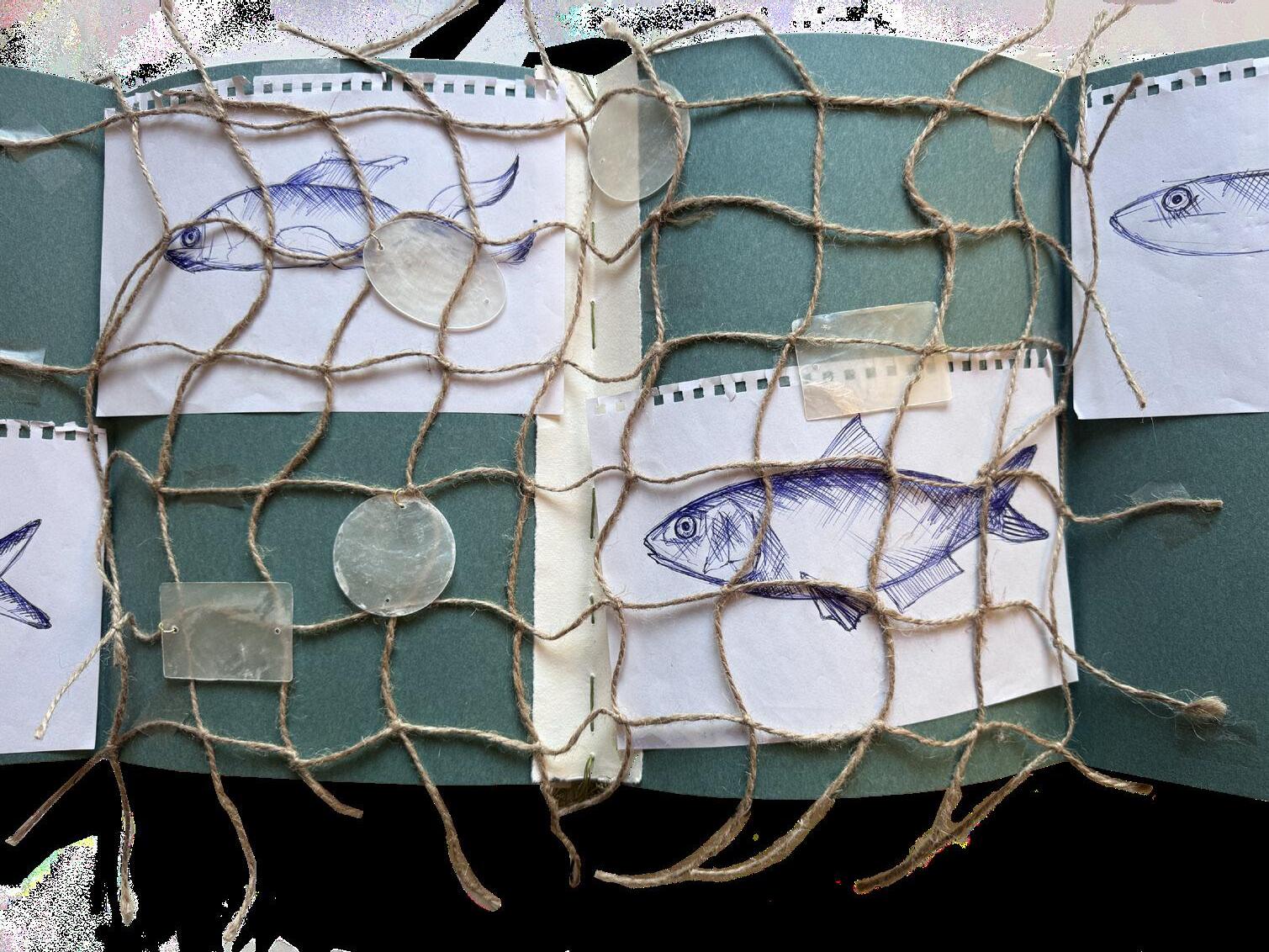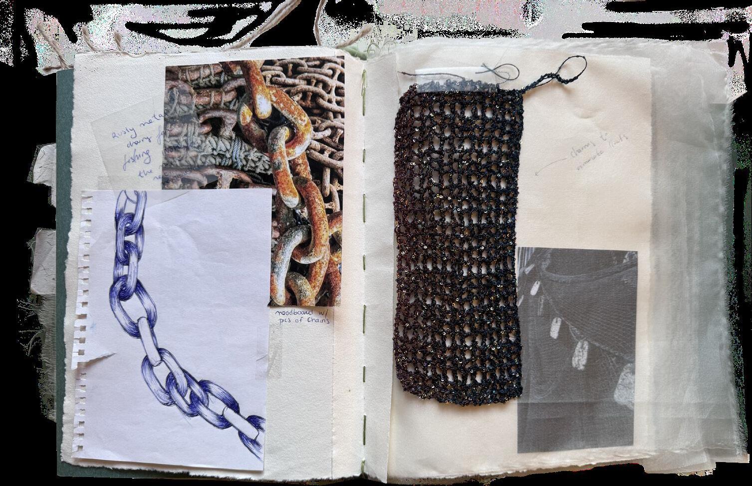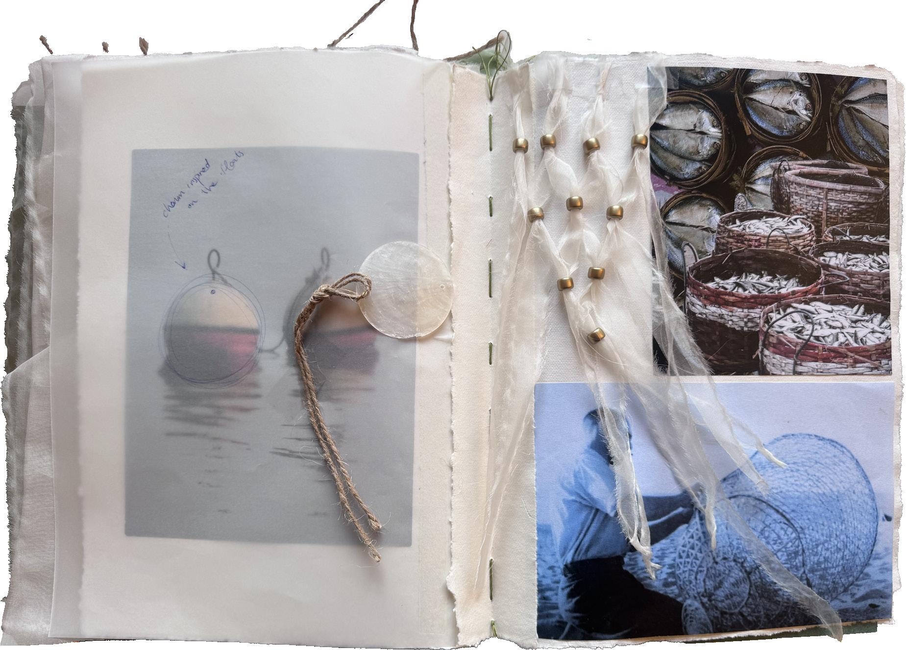This research book is entirely handcrafted, reflecting the artisanal spirit behind the Sarde collection that I developed during my final year as a fashion student. Each page is made using recycled cotton paper and carefully stitched together by hand. The pages are manually sewn to one another, creating a tactile and organic structure that echoes the importance of craftsmanship throughout the project. This handmade process gives the book a unique character, turning it into a physical extension of the collection and its creative journey.