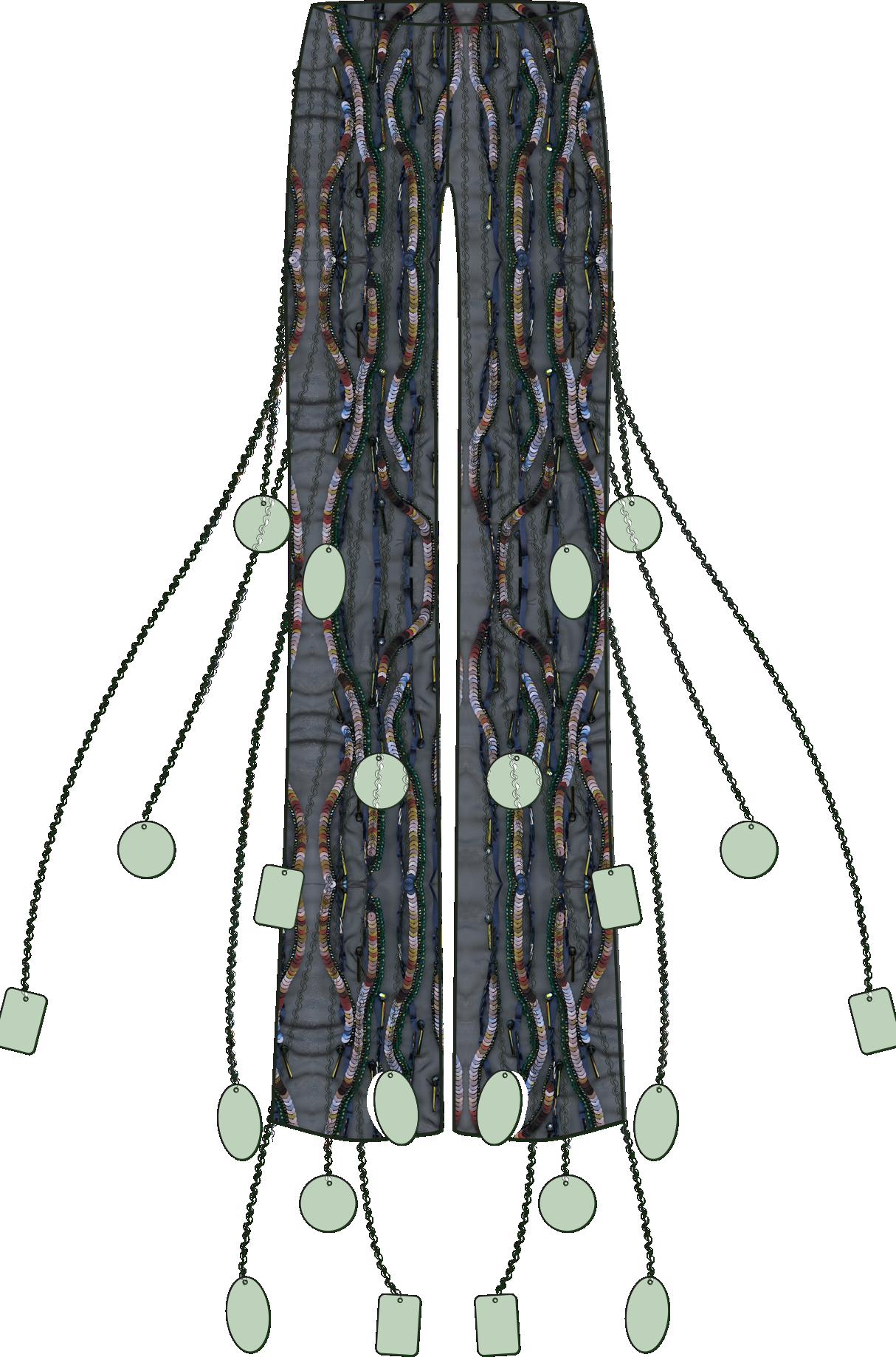 Using CLO 3D, I created artistic renders to explore garments, simulating fabrics with realistic maps and textures. I experimented with sequins and custom surface effects to develop unique textile finishes, translating material ideas into digital prototypes. The page combines these renders with the process of experimentation, showing how fabric, texture, and surface were explored and developed digitally.