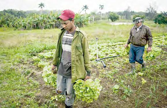 Lázaro Sánchez (derecha) y un trabajador cosechan lechugas en Minas, La Habana. Foto Ap
