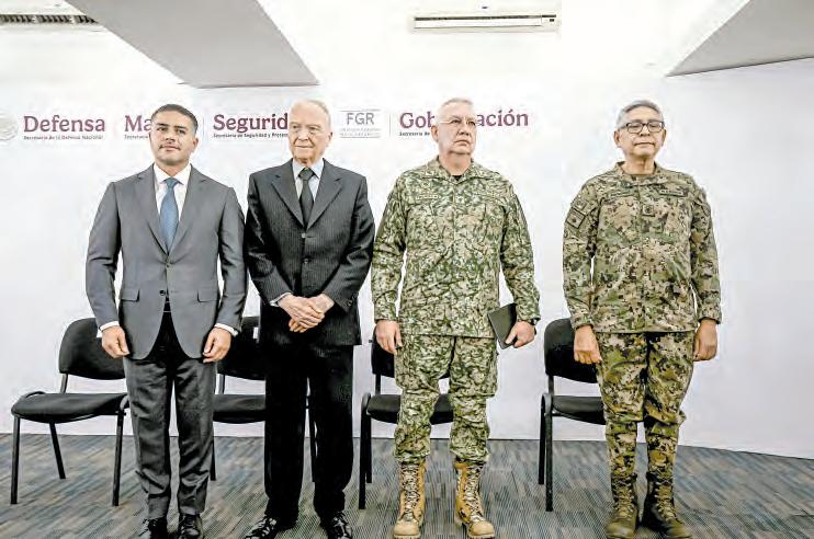 ▲ El titular de la SSPC, Omar García Harfuch; el fiscal general, Alejandro Gertz Manero, y los secretarios de la Defensa Nacional, Ricardo Trevilla, y de Marina, Raymundo Pedro Morales, en conferencia de prensa. Foto Alfredo Domínguez