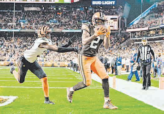 ▲ En su mejor partido del año, Cleveland se dio un festín; en la imagen Amari Cooper logra una anotación. Foto Afp