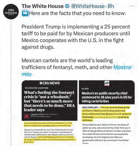 El republicano justificó la medida contra México, el principal socio comercial de Estados Unidos, con el argumento de que no ha hecho lo suficiente para detener la migración irregular y el tráfico ilícito de fentanilo, y afirmó que el gobierno mexicano y los cárteles del narcotráfico tienen “una alianza”.