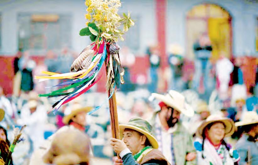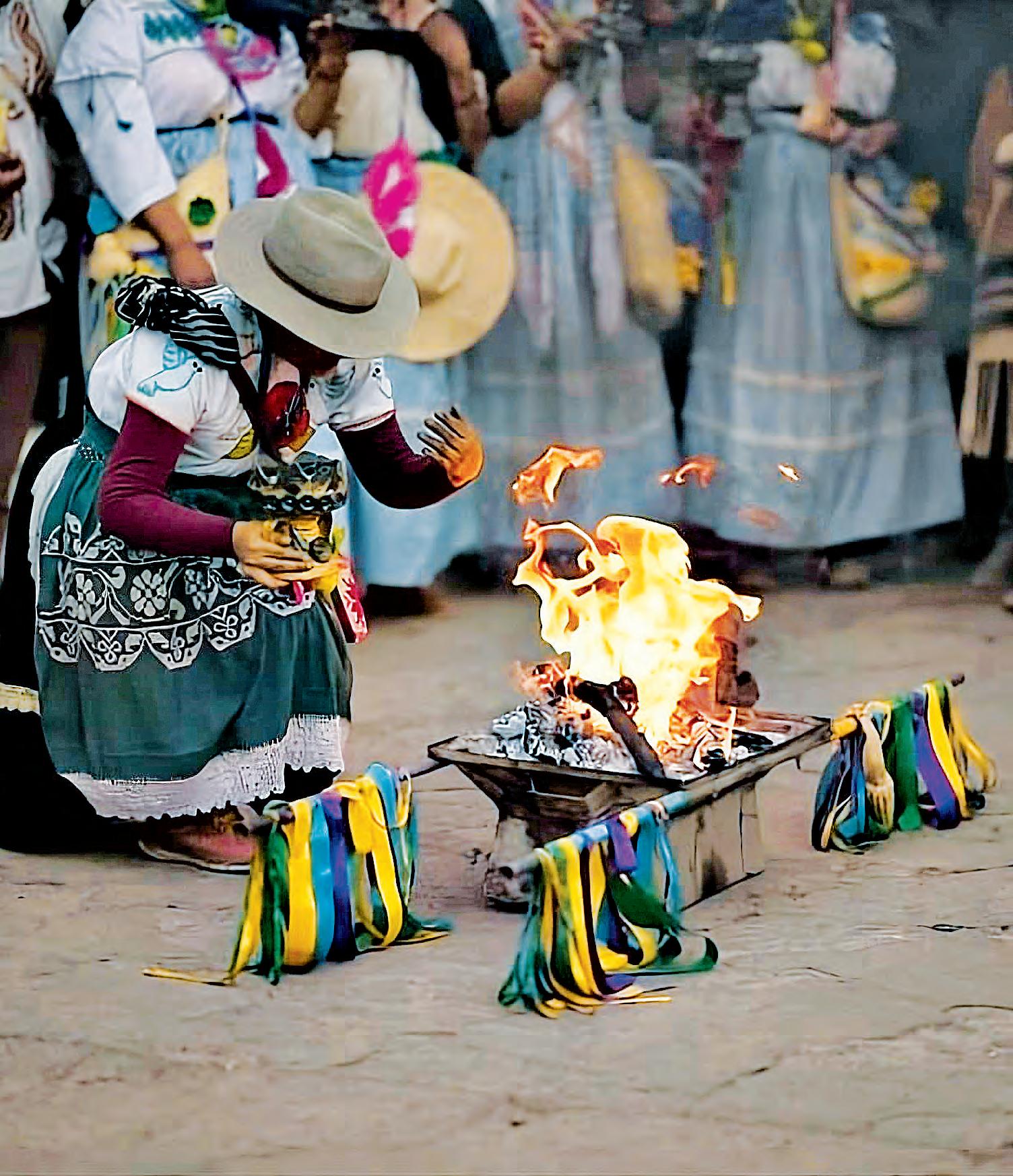 alargados salieron por la calle Moneda para dirigirse a la Catedral y regresar al inmueble cultural. En su recorrido, los participantes vestidos en tonos rojos y dorados vibrantes se cruzaron con danzantes concheros, quienes fueron ahumados con limpias mientras continuaban su baile.
