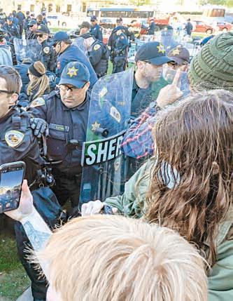 ▲ Agentes arremetieron ayer con lujo de violencia contra alumnos de la Universidad de Wisconsin, en Madison (arriba). El martes, jóvenes encararon a policías durante el desalojo en la Universidad de Columbia (derecha). Fotos Ap