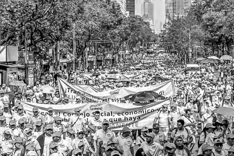 Los representantes sindicales observaban el paso de los contingentes y lanzaban uno que otro saludo a los cientos de trabajadores, quienes, con carteles y banderas monumentales, exigieron el respeto a sus derechos laborales, al tiempo que reprocharon la pérdida de su poder adquisitivo y la reducción de beneficios en sus contratos colectivos.