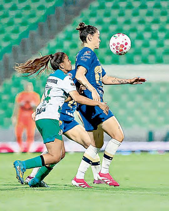 ▲ La delantera de Pumas Stephanie Ribeiro protege el balón ante el acecho de una defensora lagunera. Foto @pumasmxfemenil