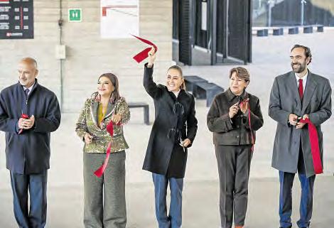 ▲ El trayecto de 57.7 kilómetros entre la CDMX y Toluca se realizará en menos de una hora a un costo de 100 pesos. Arriba, la mandataria con la jefa de Gobierno, Clara Brugada (a su derecha), y la gobernadora Delfina Gómez. Las acompañan los titulares de la SICT, Jesús Esteva, y de la ARTF, Adrián Lajous. Fotos Presidencia y Cristina Rodríguez