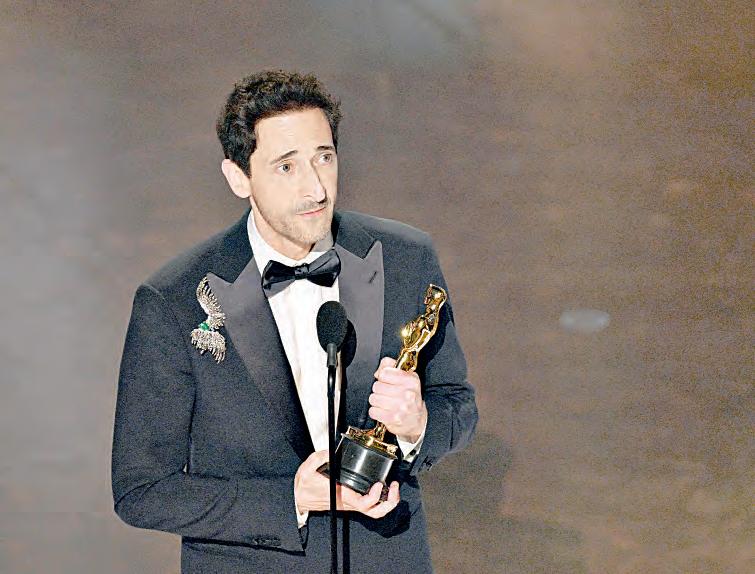filme no inglés se coronó la brasileña Aún estoy aquí, mientras No Other Land, sobre Palestina, fue reconocida en documental de largometraje. en actores protagónicos ganaron mikey madison y adrien Brody. Foto afp reDacción / P 33