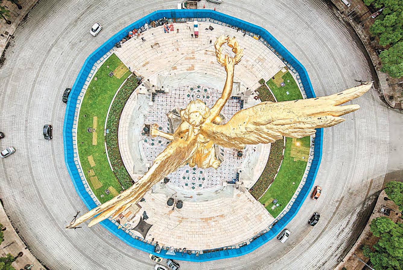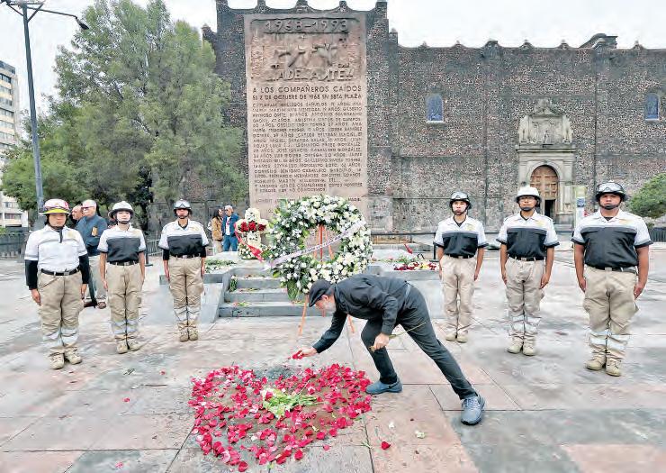 ▲ En la Plaza de las Tres Culturas, en Tlatelolco, autoridades colocaron un arreglo floral en homenaje a las víctimas de la represión. En la imagen de abajo, miembros del Comité 68 marchan rumbo al Zócalo. Fotos Marco Peláez y Germán Canseco