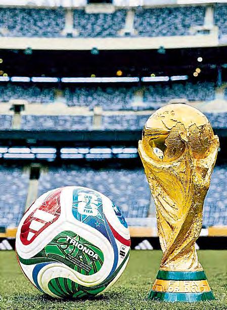 ▲ La FIFA presentó ayer la pelota que será usada durante la copa de futbol del próximo año, la cual destaca por tener los colores verde, azul y rojo, además de las imágenes de un águila, una estrella y una hoja de maple, que representan a los tres países anfitriones, así como tecnología que da información de cada uno de sus movimientos para ayudar a los árbitros en la toma de decisiones. Foto Afp REDACCIÓN / DEPORTES
