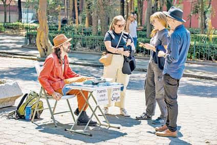 ▲ Un escritor estadunidense vende poemas, redactados al momento, en la Plaza Río de Janeiro de la colonia Roma, en la Ciudad de México. Foto Pablo Ramos