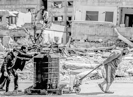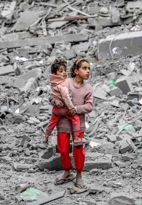 s una niña lleva en brazos a un pequeño entre las ruinas de edificios en Gaza. la creciente crisis de alimentos en la franja ha causado una catástrofe en la inmensa mayoría de la población palestina, reiteró ayer la oficina de Coordinación de asuntos Humanitarios de la onu. ‘‘una vez que se declara la hambruna es demasiado tarde para mucha gente’’, alertó. Foto afp