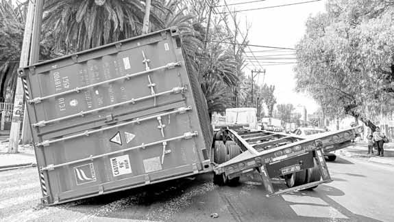 ▲ El contenedor de un trailer se desprendió de la plataforma de la pesada unidad bloqueando el tránsito vehicular en la avenida