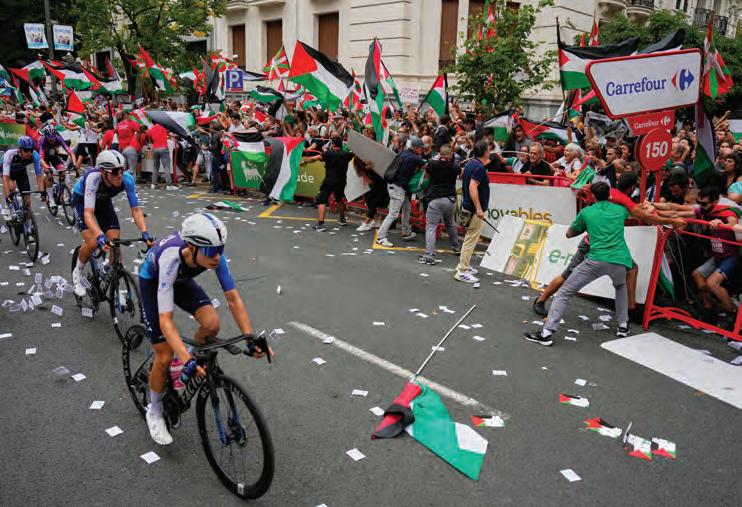 t Al grito de “Israel genocida”, cientos de personas intentaron bloquear al equipo de ciclistas de ese país, por lo que los organizadores dejaron sin ganador la etapa celebrada en el País Vasco. Foto