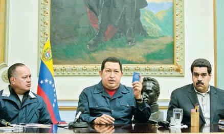 ▲ Chávez, flanqueado por el titular de la Asamblea Nacional, Diosdado Cabello (izquierda), y su vicepresidente y sucesor, Nicolás Maduro,en Caracas el 8 de diciembre de 2012. Foto Afp